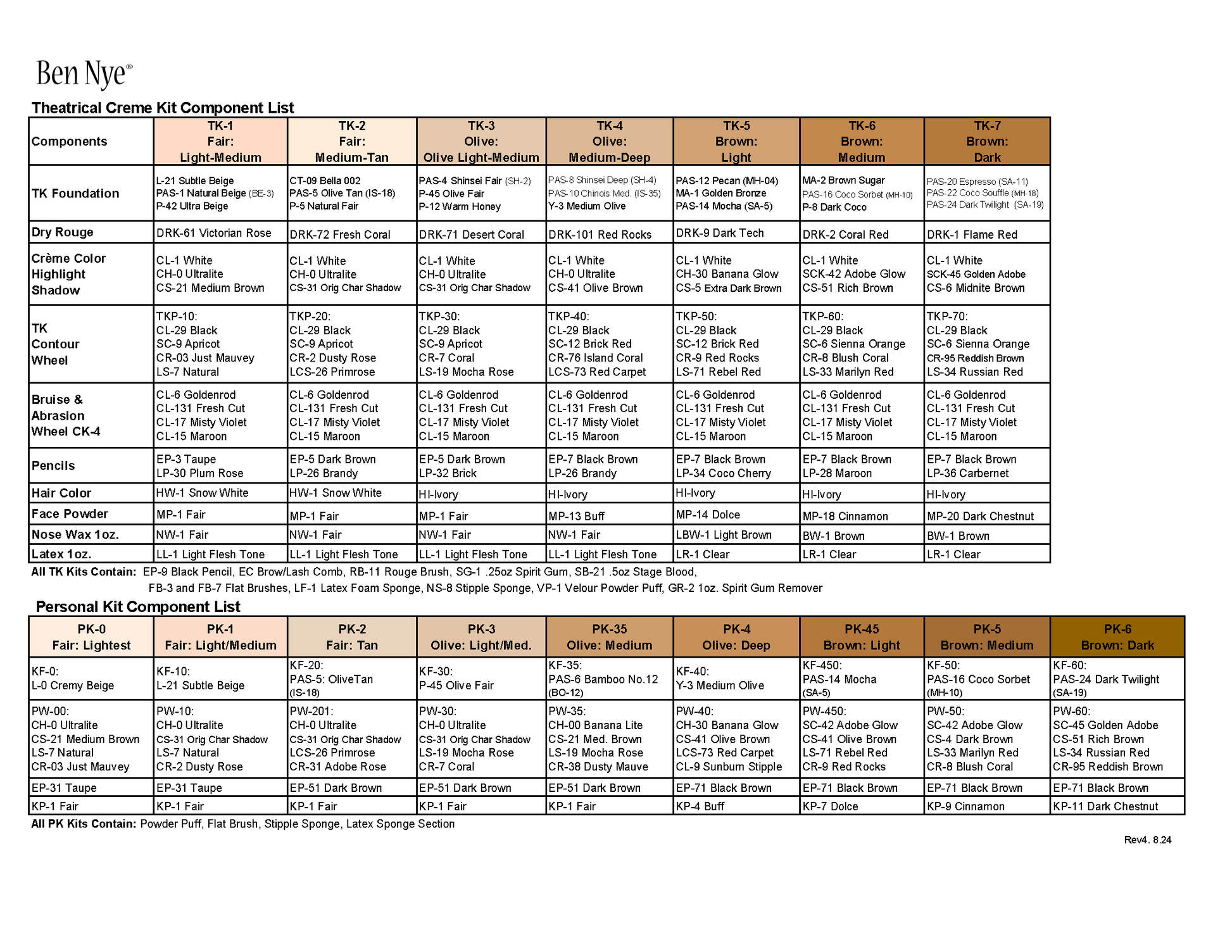 This kit enables performers, students, or anyone wanting to acquire a versatile collection of high-quality performance grade makeup to portray a broad spectrum of characters. Seven skin tone specific kits are available in a range of fair, light, olive, and brown skin tones.