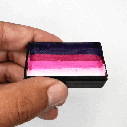 Fusion Body Art’s split cakes just require a flat face painting brush and water to get started. For flowing cheek art designs use a 1” flat brush to load all of the colours in the split cake or use smaller flat brushes to just pick up a few of the colours. Make sure to start with a slightly damp brush and add more water as needed by just dipping one corner of the brush lightly into your water. If you are new to 1 stroke face painting, the internet is filled with tons of amazing 1 stroke design ideas to inspire you.
