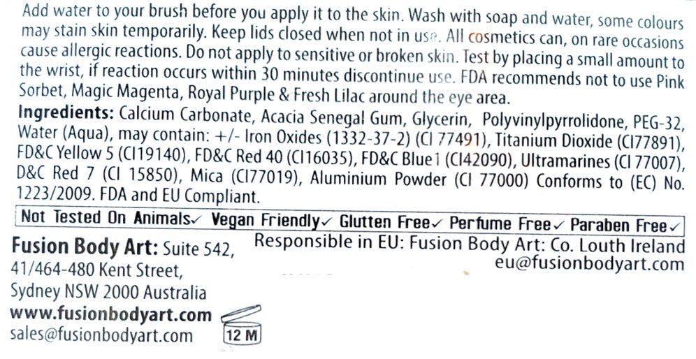 Fusion Face and Body Paints are made in China under the direction of the owners of Fusion Body Art, which is based in Australia. All FD&C and D&C pigments are manufactured in the USA, guaranteeing that only the safest pigments make it into Fusion Body Art. Fusion paints are paraben free and are not made from animal biproducts or tested on animals.Store Fusion Body Art Paints in a dry location away from extreme heat, humidity or cold. Use paint within 12 months from opening to ensure freshness.