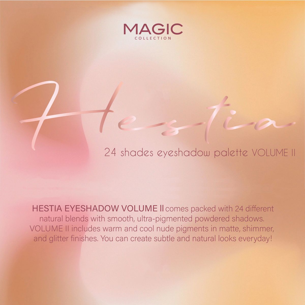 HESTIA EYESHADOW VOLUME ll comes packed with 24 different natural blends with smooth, ultra-pigmented powdered shadows.